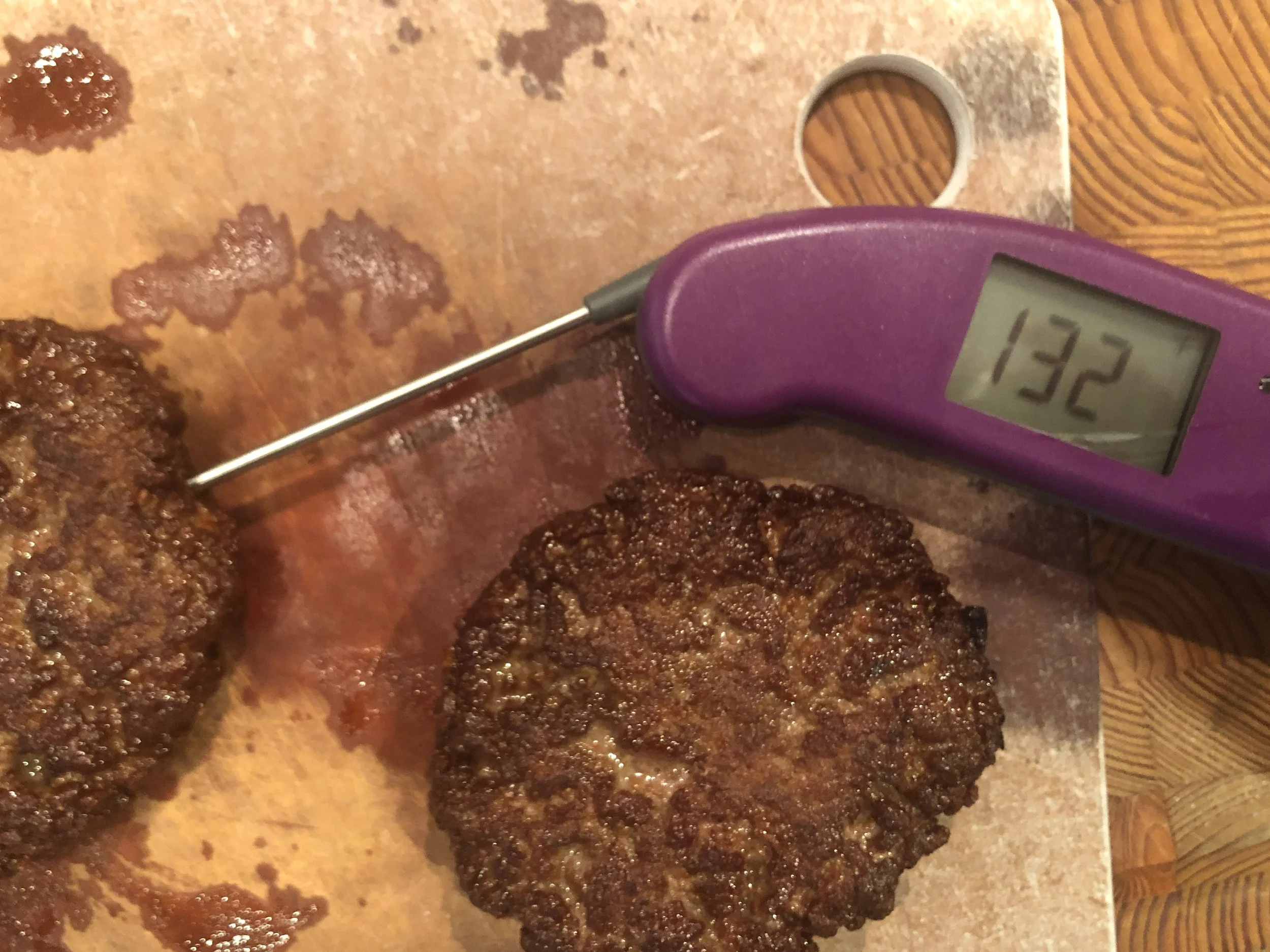 Below are the burgers after the first sear with a nice Maillard crust, and as you can see, although the surface is cooked, the interior temperature remains near frozen at 33°F.