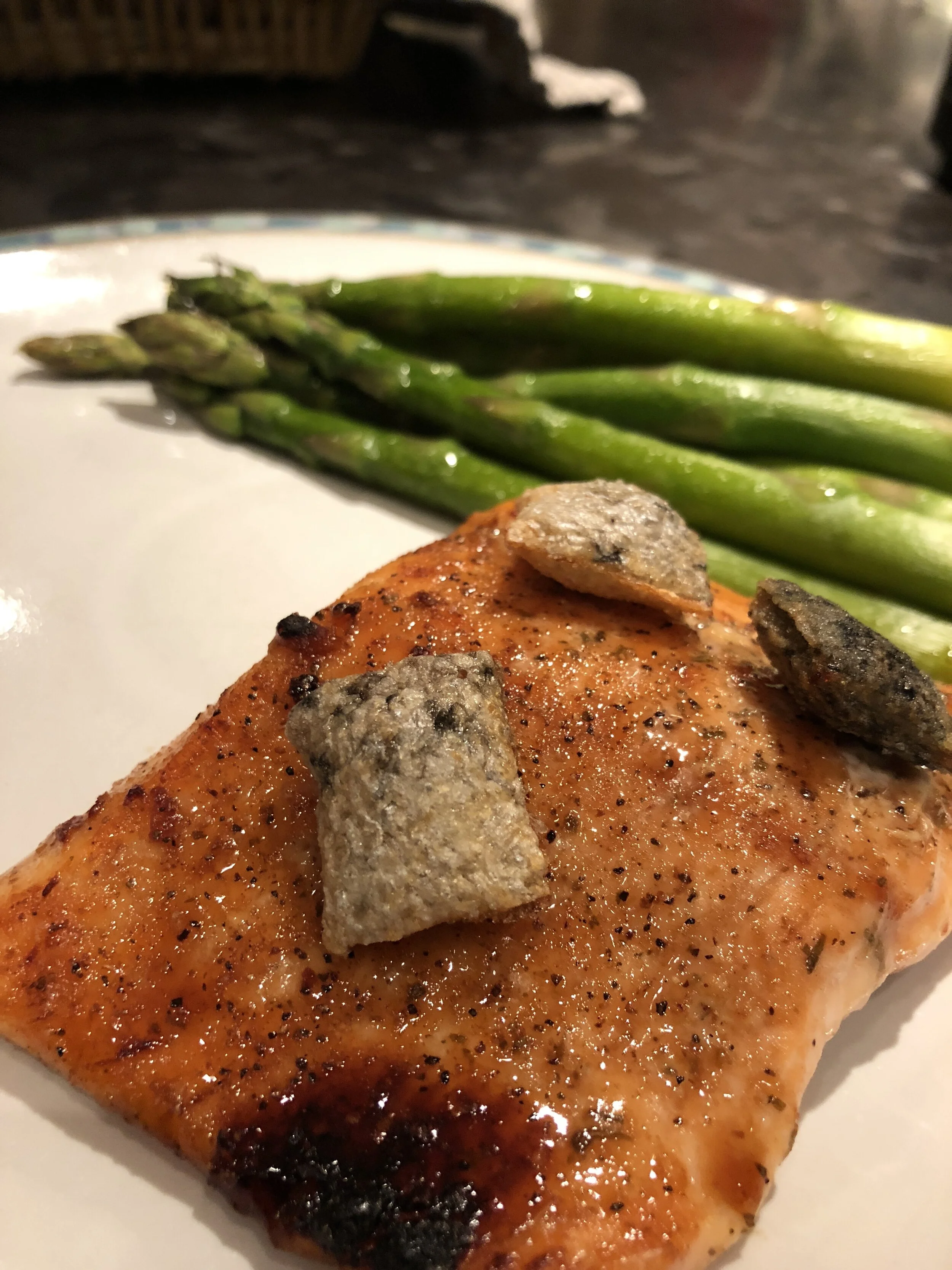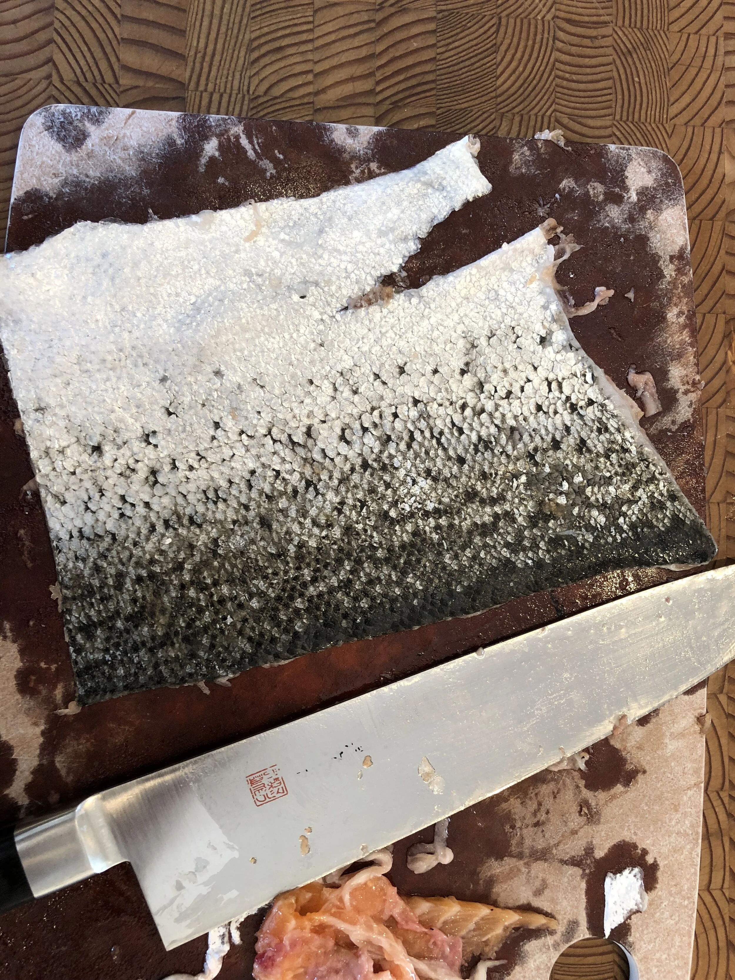Before describing another novel technique, some background information. Fish skin, indeed all skin is comprised of the interweaving of helical collagen fibres. If not cooked, it is rubbery and tough; after all, its purpose is to protect underlying tissue. However, with sufficient heat from cooking, the collagen coils unwind and break into smaller segments, ie they “hydrolyse”, becoming tender enough to eat, and with the high heat, crispy. As noted, the trick is to do this without overcooking the meat / fish. Alternatively, instead of using high heat, one can use moderate heat, if there is lots of moisture, and you have lots of time! Sous vide is an ideal technique for this. The skin removed from the fish is placed in a bag and vacuum packed which keeps it moist during the cooking process. It can then be cooked for hours at the ideal temperature. Unfortunately, we are back where we started though; perfectly cooked skin which still needs to be crisped.