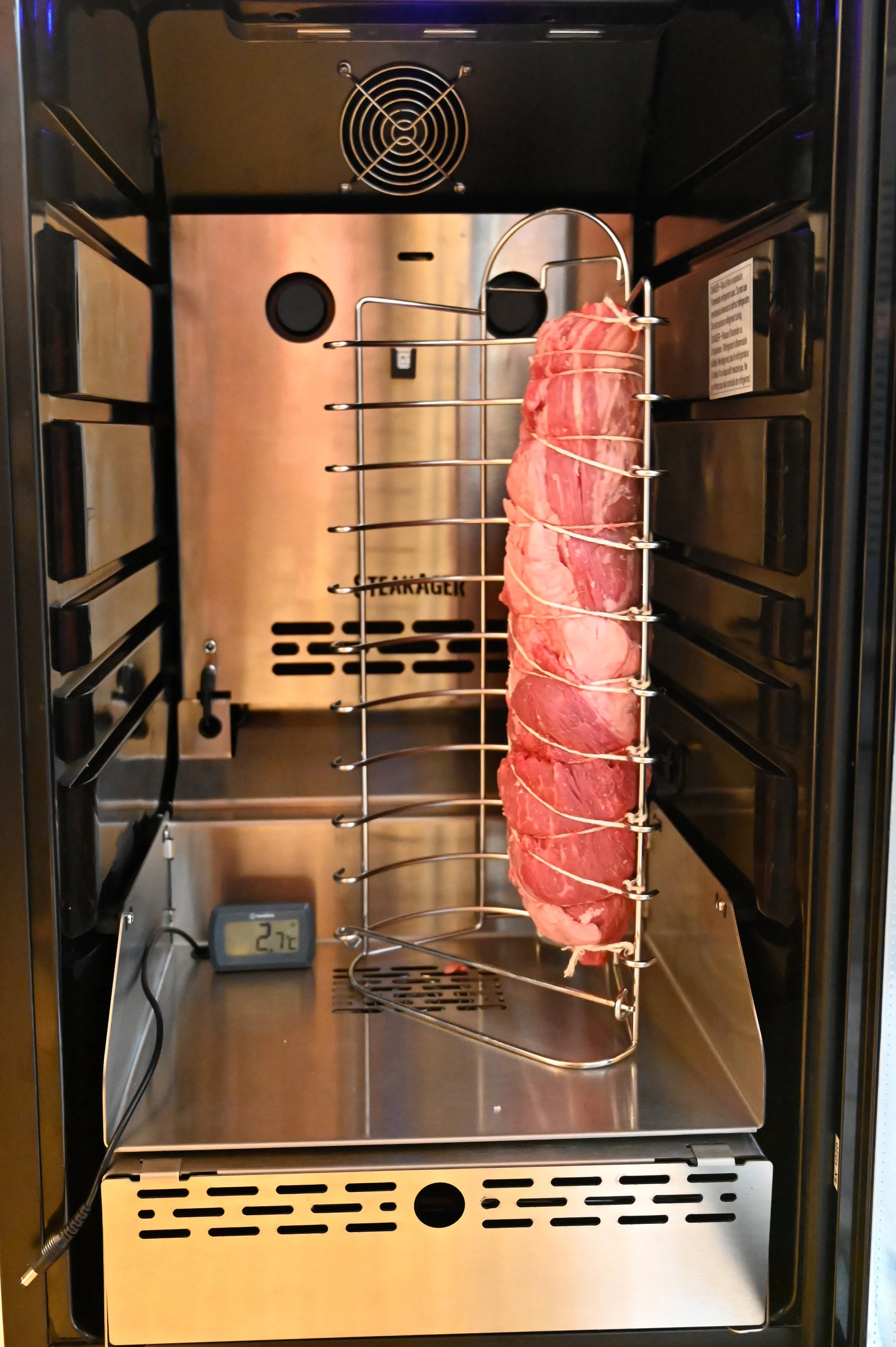 To create an even cylindrical shape, I used some butcher’s twine. This then went in to my dedicated drying fridge, a PRO 40 from Steakager for 15 days. Not too long so as to preserve meat yield, but long enough to both enhance tenderness and to a lesser extent flavour of an otherwise bland tasting cut of meat.