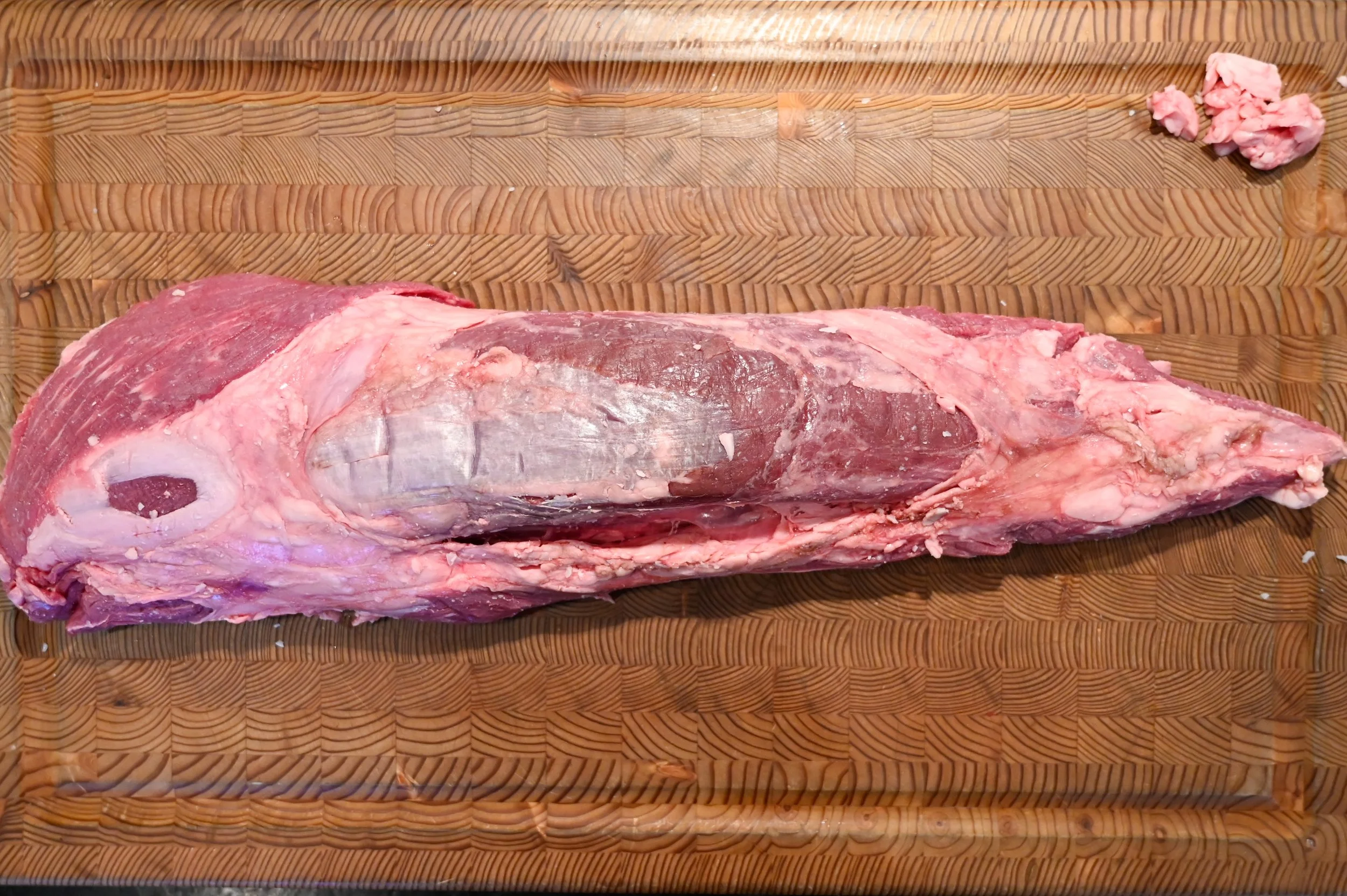 To limit water and trim loss, its best to have a big piece of meat with relatively little surface area, and what surface area there is would have been trimmed away anyway. So rather than getting a prepared tenderloin, I sourced an untrimmed piece with the silver skin, chain, and side muscle attached (known as PSMO; peeled side muscle on).
