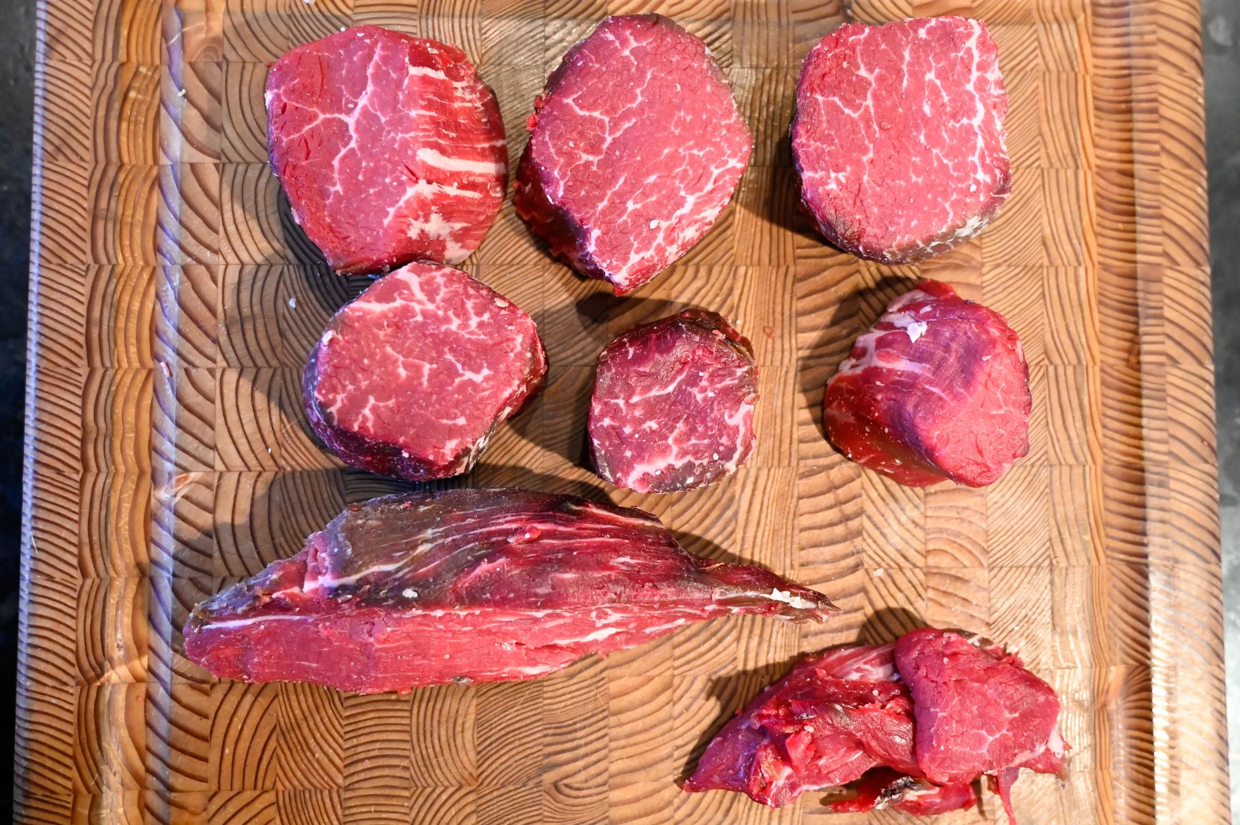 The DA tenderloin cut into 6 individual steaks (top of picture). The heal is seen on the bottom left with a little extra trim from chain at bottom right.