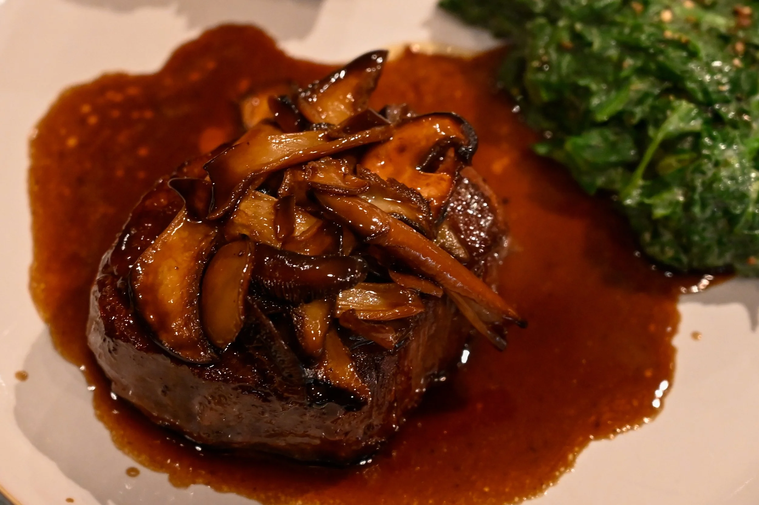 Topped with sautéd “gourmet” mushroom mix and home made demi-glace tableside.